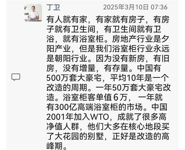 大家都说房地产行业是夕阳行业,但是我觉得浴室柜行业永远都是朝阳行业。我3月10号有感而发,在朋友圈分享中提到:有人就有家,有家就有房子,有房子就有卫生间,有卫生间就有卫浴、有浴室柜。不管市场怎么变,没有增量有存量,没有新房有旧房。