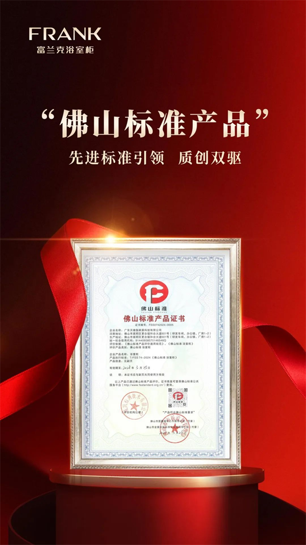 此前,佛山市场监督管理局公布《佛山标准产品目录(第六批)》名单,富兰克浴室柜成功获得“佛山标准产品”认证。