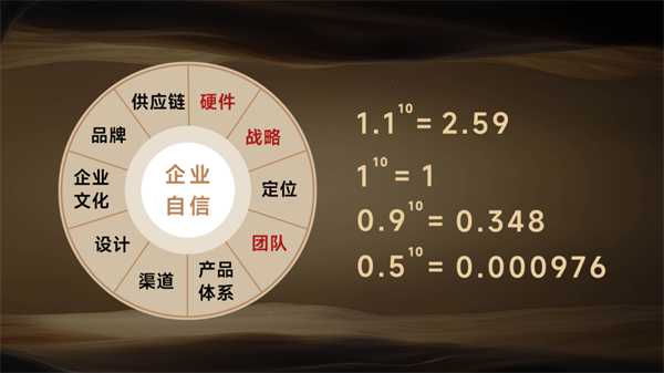 企业经营在我看来与高考有共通之处,市场竞争比拼的是综合实力,就如高考,仅仅是某一科有高分是不够的,能否最终胜出要看总得分,我们不做偏科生,我们做全面发展的好品牌。华杉老师说:品牌经营任何事情都是一件事。1、0.9和0.5单看差值不大,但如果分别用10个1.0、10个0.9、10个0.5相乘,则是1、0.348和0.000976的差别。今差之毫厘,后必谬以千里。一个维度的胜出不是经营企业的的法宝,唯有整个系统总得分的遥遥领先才是高维战略。